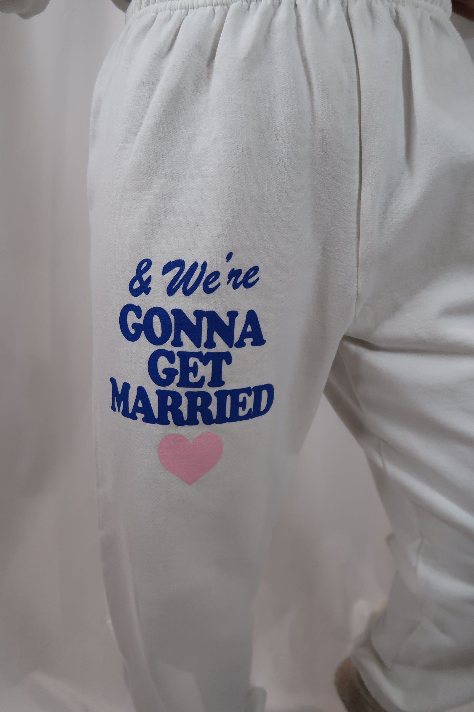 Goin' to the chapel and we're gonna get ma-a-arried. These bridal white sweatpants are the perfect gift for your girl who just got engaged, a bachelorette gift or something to throw on for the big day! We love the bright pop of "something blue." Oh, and don't forget the matching sweatshirt ;)