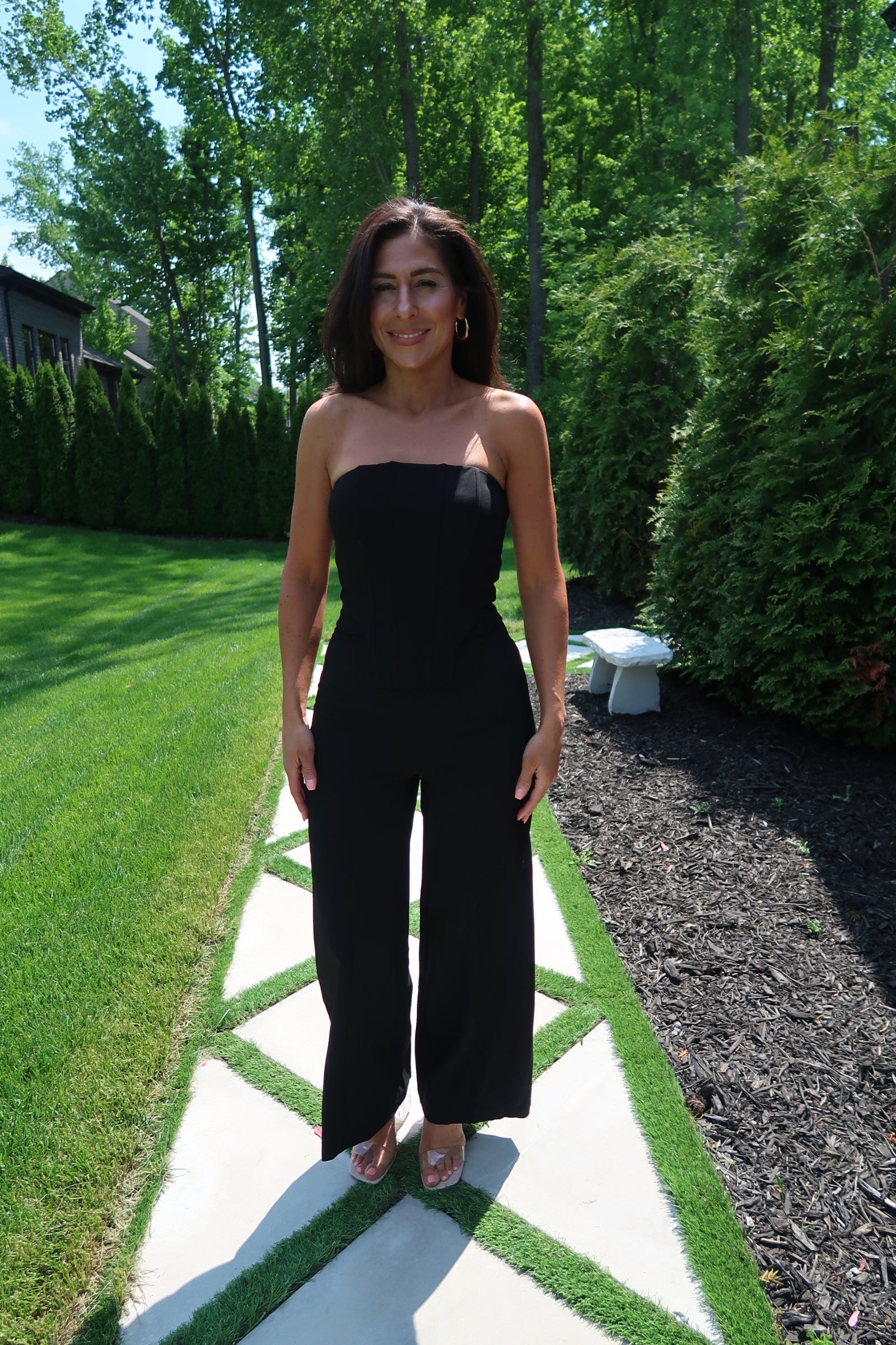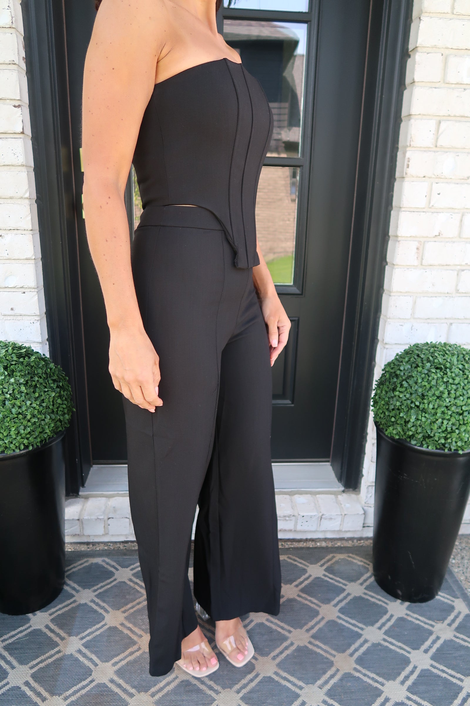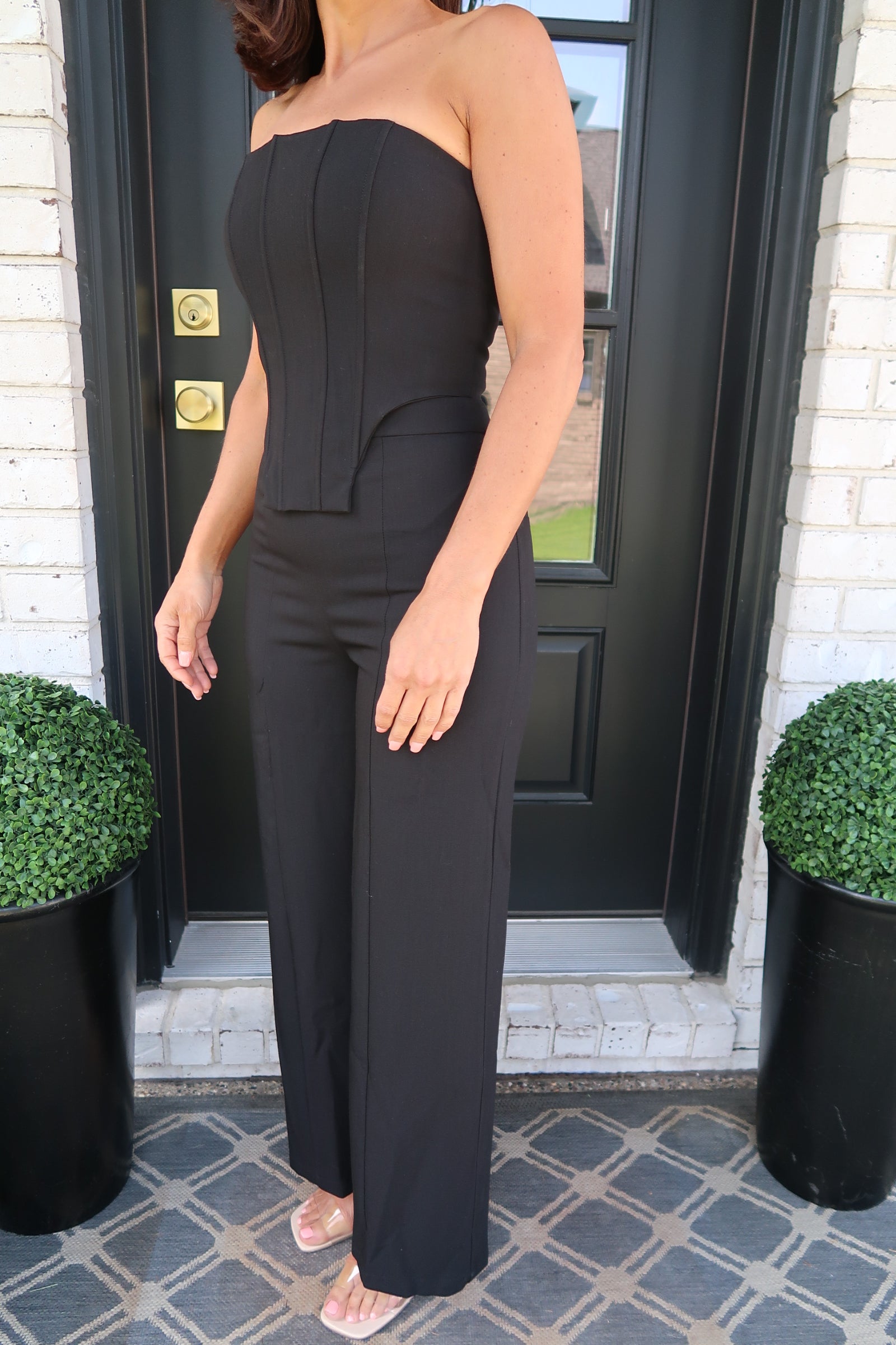 Elevate your style with this sophisticated strapless black jumpsuit. This jumpsuit features a structured bodice that accentuates the waist and creates a sleek silhouette. The high-waisted pants are designed with a wide-leg cut, offering both comfort and a contemporary look. Perfect for formal events, evenings out, or any occasion where you want to make a statement.