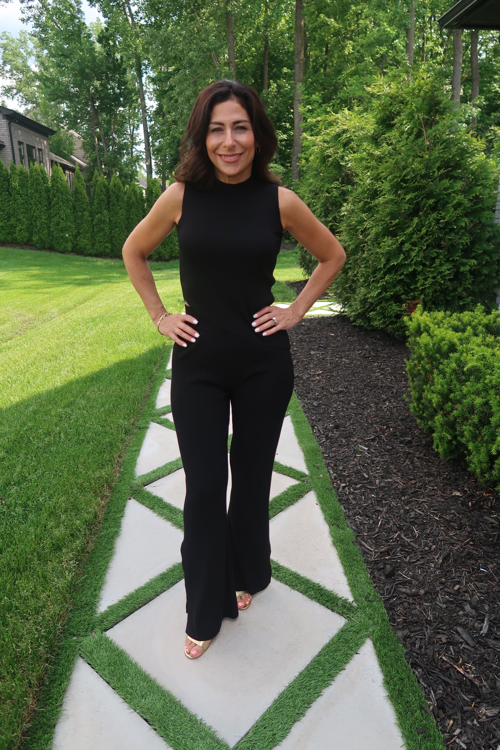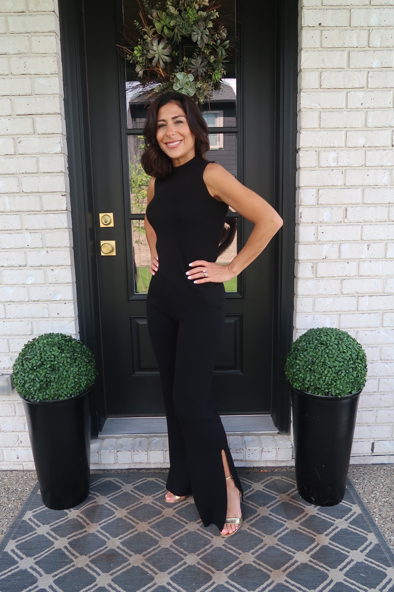 This outfit features a sleek, sleeveless design with a high neckline that exudes modern elegance. The top part has an asymmetrical wrap detail that adds a unique and chic touch to the outfit and offers a tailored fit that accentuates the waist, providing a flattering silhouette. The pants are wide-legged with subtle side slits at the hem, giving ease of movement and a fashionable edge.