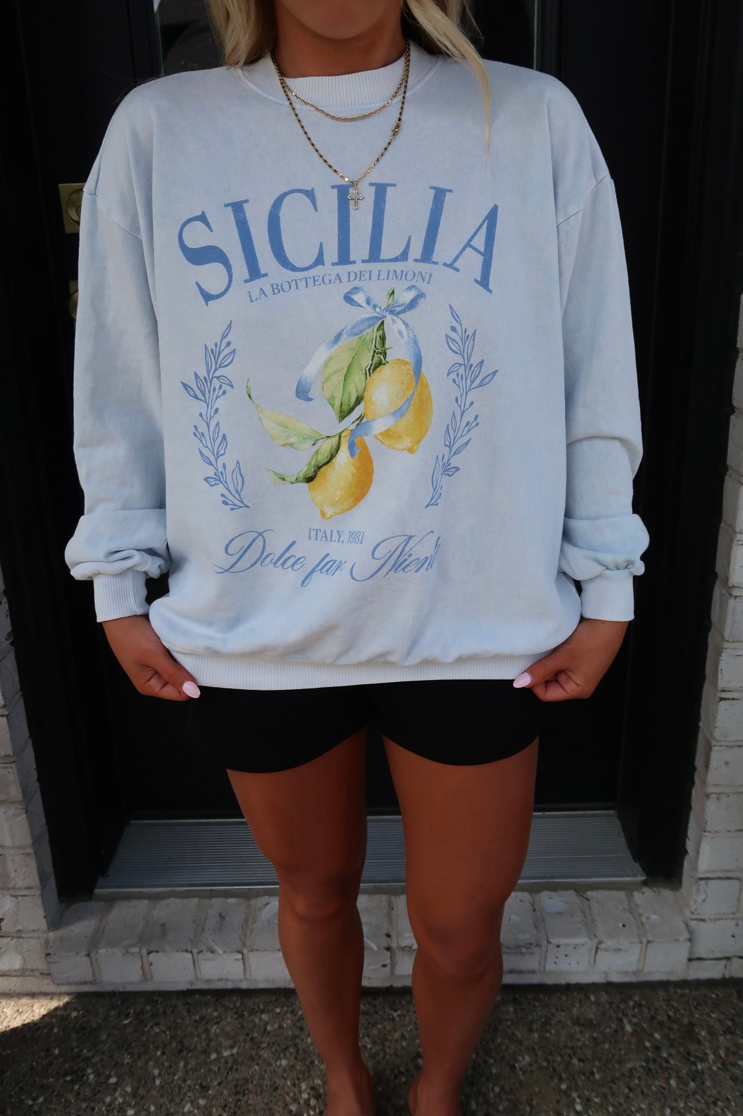Embrace the charm of Sicily with our Sicilia Lemon Print Mineral Wash Crewneck Shirt. This cozy and stylish shirt features a vibrant lemon print pattern with its vintage style and fit.