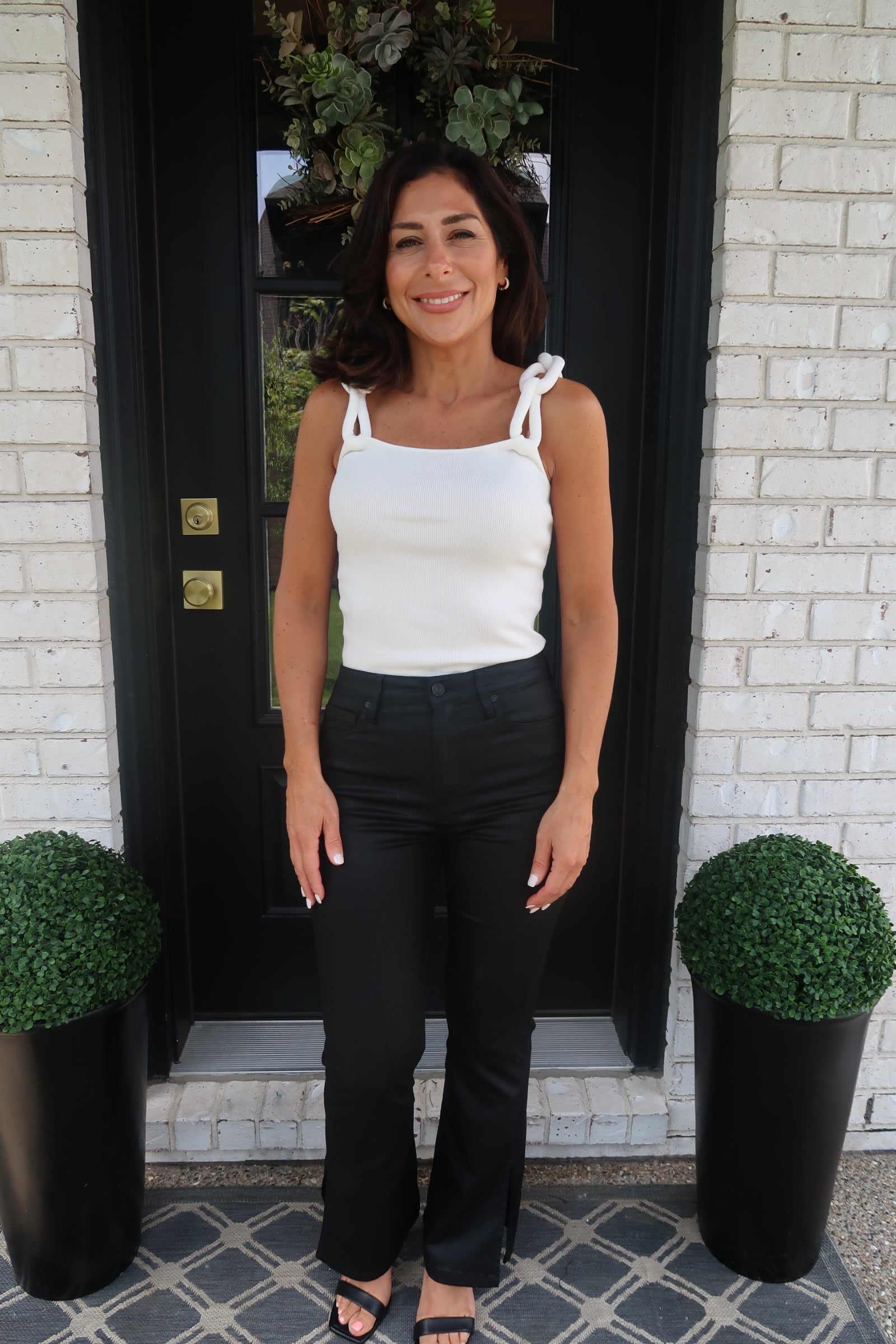 Elevate your basics with this chain bodysuit, a versatile piece that adds a touch of sophistication to any outfit. This chic tank top features knotted straps that create a unique and stylish look. Made from high-quality, stretchy ribbed fabric, this top offers a comfortable and flattering fit. The clean, minimalist design makes it easy to pair with a variety of bottoms, from jeans to skirts.